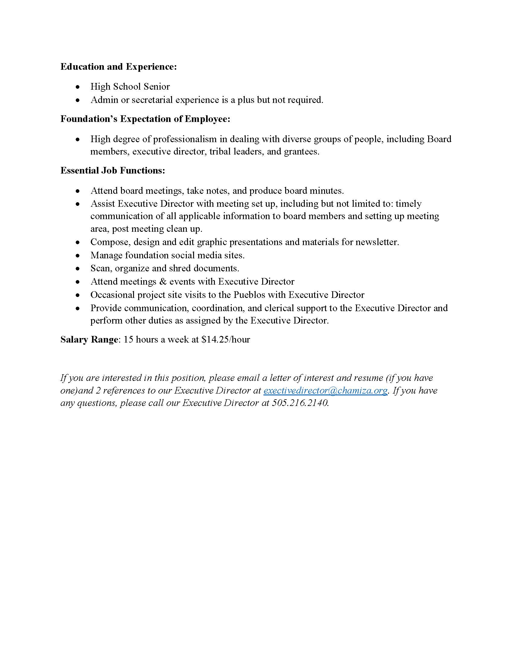 Additionally, the Chamiza Foundation is looking for a summer intern. If you know a student who might be interested, please have them contact me. The internship description is located below.